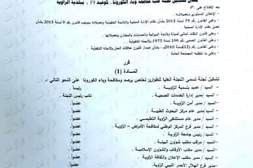قرار عميد بلدية الزاوية الصادر يوم الأحد الماضي. رقم ( 3) لسنة 202‪0 بشأن تشكيل لجنة عليا لمكافحة وباء الكورونا ( كوفيد 19) ببلدية الزاوية.يعمل بهذا القرار من تاريخ صدوره وينشر في وسائل الإعلام المحلية.